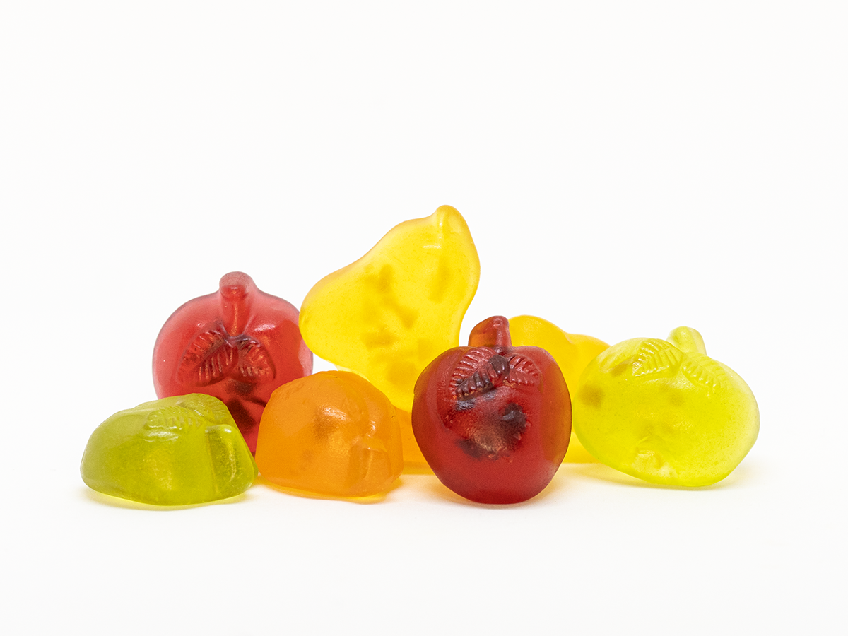 Zutaten: Glukosesirup; Zucker; 9 % Fruchtsaft aus Fruchtsaftkonzentraten (Pfirsich, Birne, Kirsche, Apfel); Gelatine; 4 % Fruchtstücke (Apfel, Pfirsich, Kirsche, Brombeere, Schwarze Johannisbeere); Säuerungsmittel: Citronensäure, Milchsäure; Geliermittel: Pektin; Aroma; färbende Lebensmittel (Schwarze Johannisbeere, Schwarze Karotte, Saflor, Karotte, Zitrone, Spirulina); Überzugsmittel: Bienenwachs weiß und gelb, Carnaubawachs.